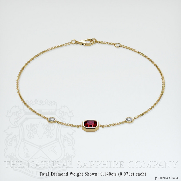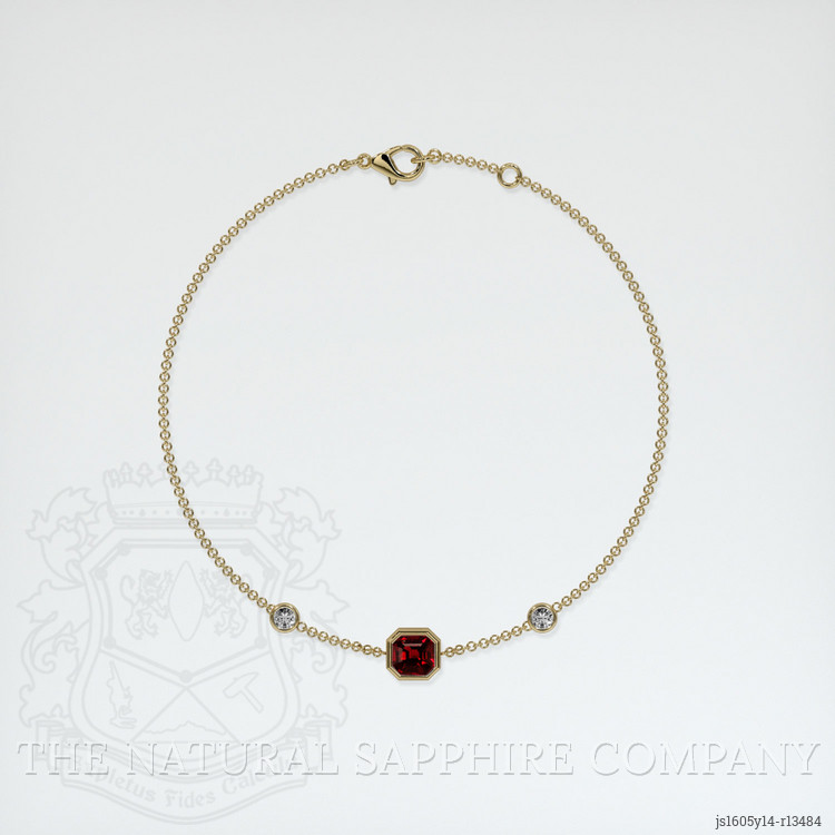 The bracelet features a beautiful, transparent 0.89 carat asscher - octagon shape red ruby with the dimensions of 5.37 x 5.18 x 3.53 mm and a asscher cut. It has a clarity grade of very slightly included (evaluated at eye level), vivid color saturation, and an excellent polish. The origin of this ruby is Mozambique.