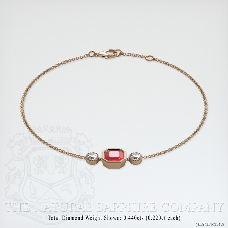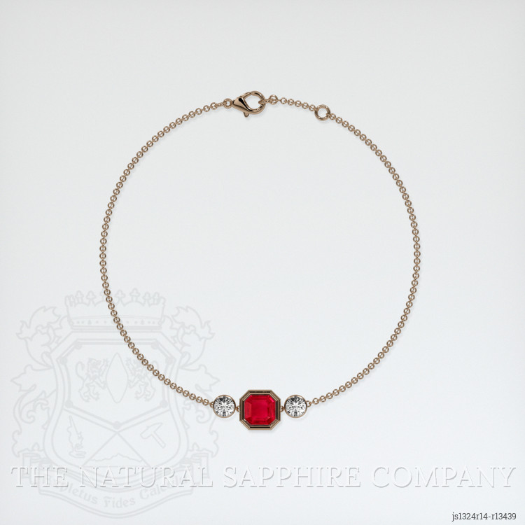 The bracelet features a beautiful, transparent GIA certified Red 1.35 carat asscher - octagon shape red ruby with the dimensions of 6.64 x 6.56 x 3.33 mm and a asscher cut. It has a clarity grade of very slightly included (evaluated at eye level), vivid color saturation, and an excellent polish. The origin of this ruby is Burma (Myanmar).