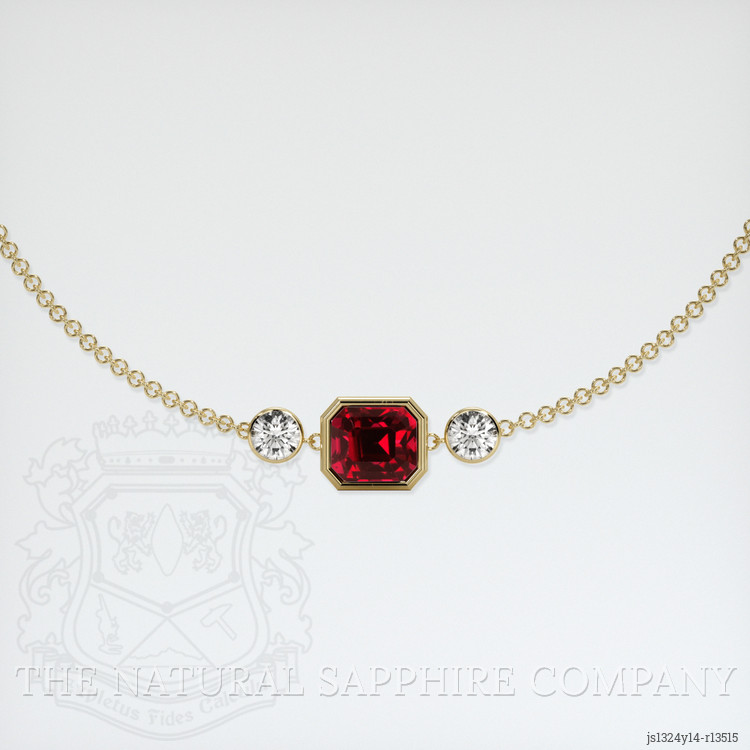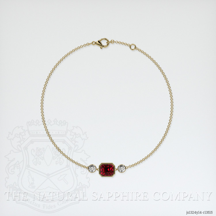 The bracelet features a beautiful, transparent GRS certified Vivid Red “Vibrant” 1.55 carat asscher - octagon shape red ruby with the dimensions of 6.22 x 5.54 x 4.94 mm and a asscher cut. It has a clarity grade of eye clean (evaluated at eye level), vivid color saturation, and an excellent polish. The origin of this ruby is Mozambique.