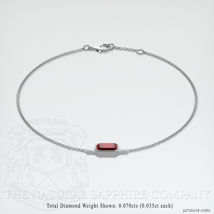 The bracelet features a beautiful, transparent 0.95 carat emerald cut shape red ruby with the dimensions of 6.99 x 4.20 x 3.22 mm and a emerald cut. It has a clarity grade of eye clean (evaluated at eye level), vivid color saturation, and an excellent polish. The origin of this ruby is Mozambique.