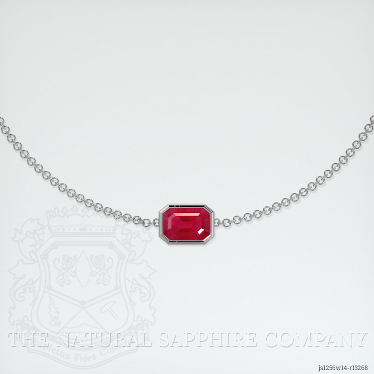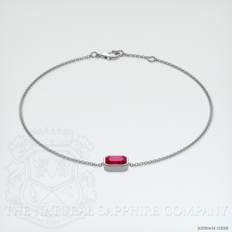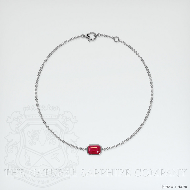 The bracelet features a beautiful, transparent 1.03 carat emerald cut shape red ruby with the dimensions of 7.03 x 4.86 x 3.05 mm and a emerald cut. It has a clarity grade of very slightly included (evaluated at eye level), intense color saturation, and an excellent polish. The origin of this ruby is Mozambique.