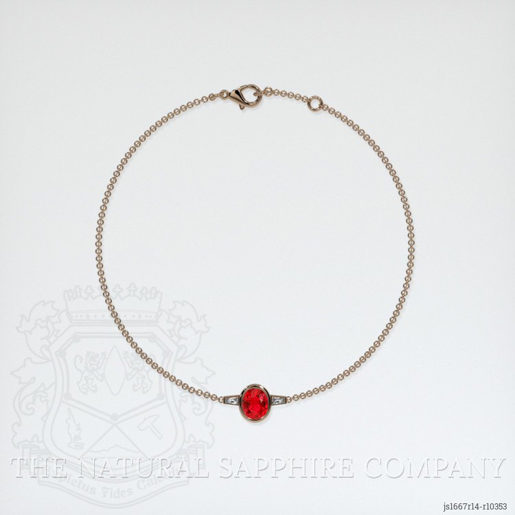 The bracelet features a beautiful, transparent 1.06 carat oval shape red ruby with the dimensions of 6.31 x 5.19 x 3.67 mm and a mixed brilliant cut. It has a clarity grade of very slightly included (evaluated at eye level), vivid color saturation, and an excellent polish. The origin of this ruby is Mozambique.