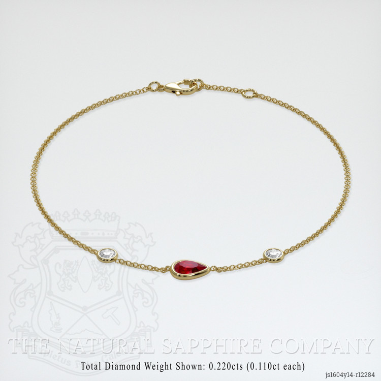 The bracelet features a beautiful, transparent 0.45 carat pear shape red ruby with the dimensions of 6.19 x 4.09 x 2.43 mm and a mixed brilliant cut. It has a clarity grade of very slightly included (evaluated at eye level), vivid color saturation, and an excellent polish. The origin of this ruby is Vietnam.