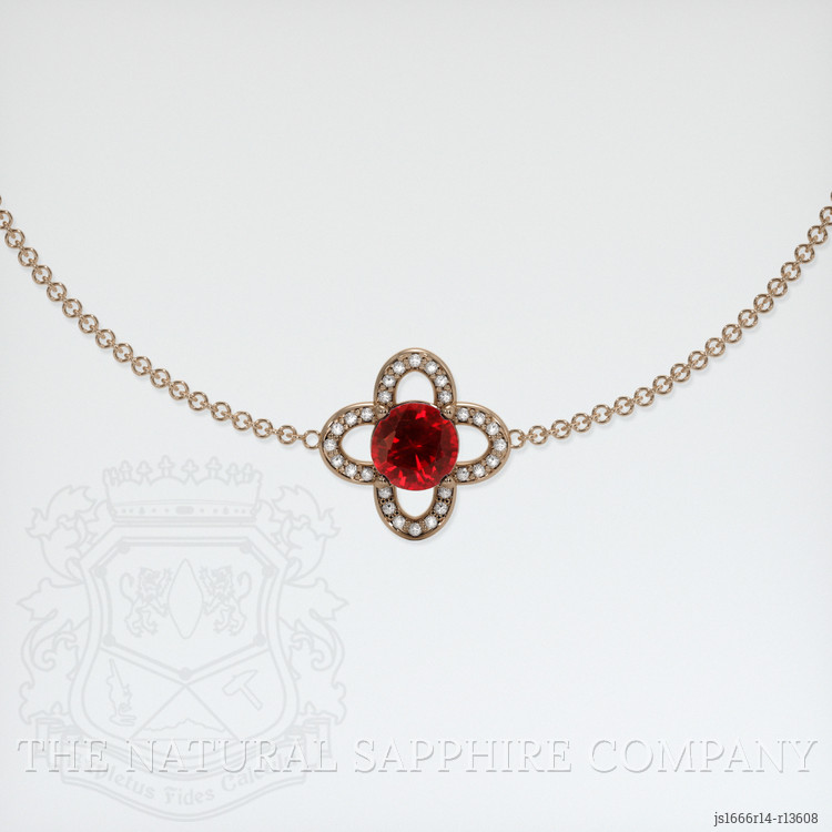 The bracelet features a beautiful, transparent 0.89 carat round shape red ruby with the dimensions of 5.53 x 5.41 x 3.85 mm and a mixed brilliant cut. It has a clarity grade of very slightly included (evaluated at eye level), vivid color saturation, and an excellent polish. The origin of this ruby is Mozambique.