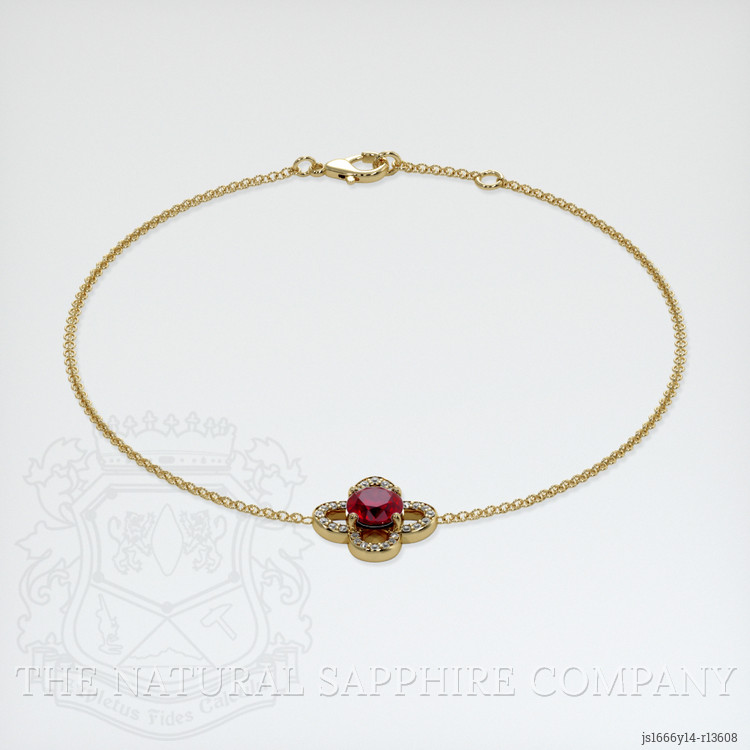 The bracelet features a beautiful, transparent 0.89 carat round shape red ruby with the dimensions of 5.53 x 5.41 x 3.85 mm and a mixed brilliant cut. It has a clarity grade of very slightly included (evaluated at eye level), vivid color saturation, and an excellent polish. The origin of this ruby is Mozambique.