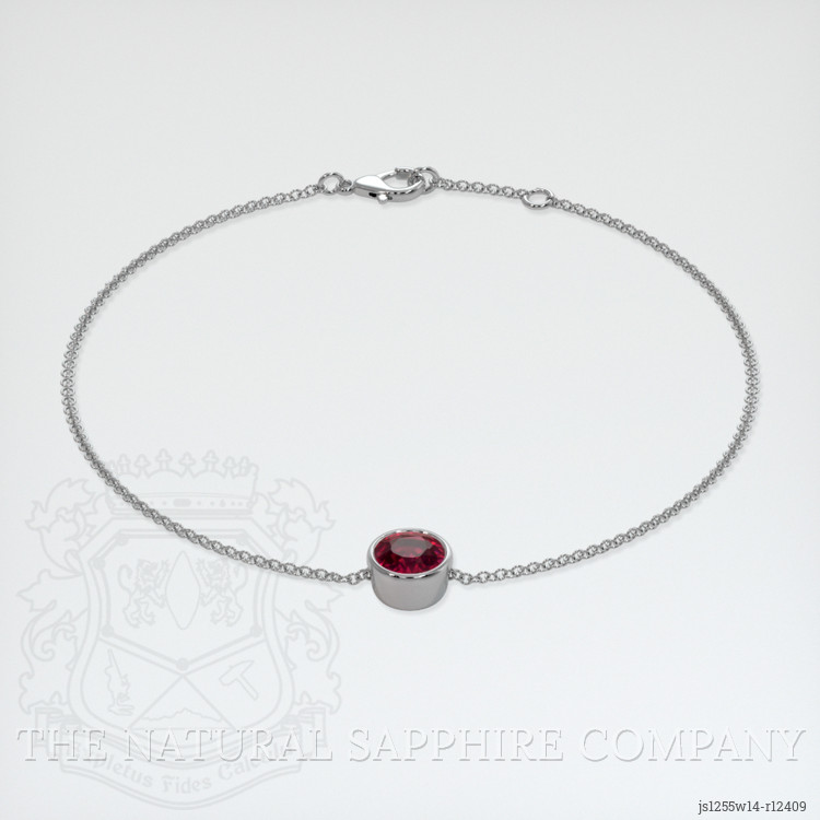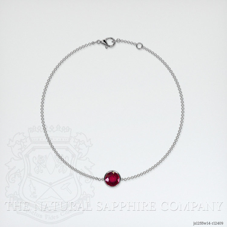 The bracelet features a beautiful, transparent 1.56 carat round shape red ruby with the dimensions of 6.47 x 6.35 x 4.39 mm and a mixed brilliant cut. It has a clarity grade of very slightly included (evaluated at eye level), vivid color saturation, and an excellent polish. The origin of this ruby is Mozambique.