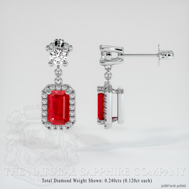 The earrings feature a beautiful, transparent pair of rubies that are 1.10 total carat weight. They are emerald cut shape red rubies, with the dimensions of 6.01 x 3.94 x 2.12 mm and are step cut, have a clarity grade of very slightly included (evaluated at eye level), vivid color saturation, and an excellent polish. The origin of this pair of rubies is Mozambique.