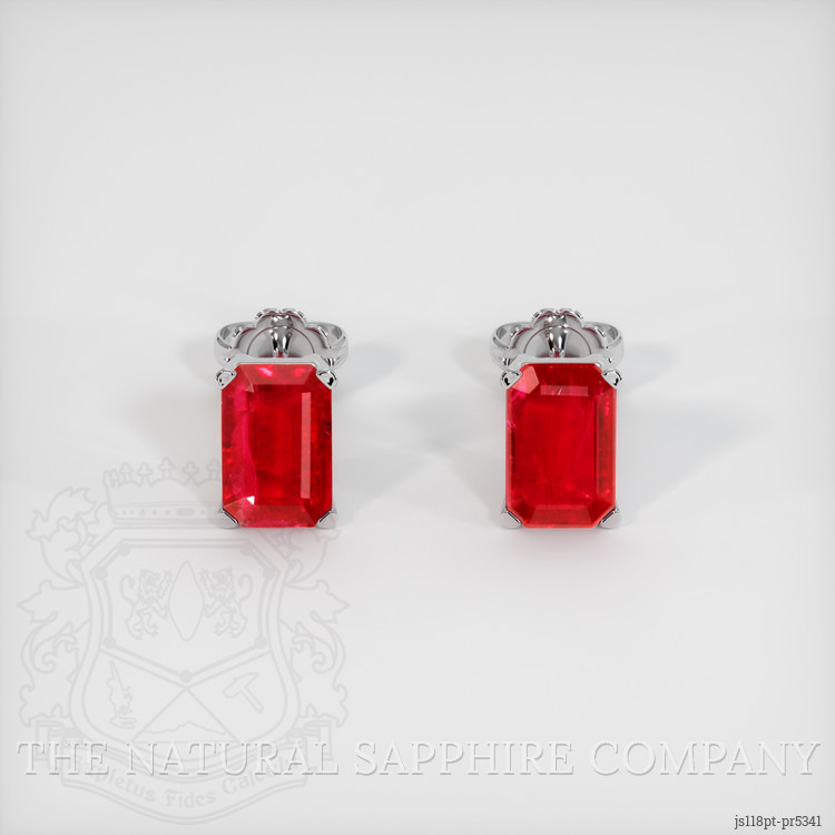 The earrings feature a beautiful, transparent pair of rubies that are 1.10 total carat weight. They are emerald cut shape red rubies, with the dimensions of 6.01 x 3.94 x 2.12 mm and are step cut, have a clarity grade of very slightly included (evaluated at eye level), vivid color saturation, and an excellent polish. The origin of this pair of rubies is Mozambique.