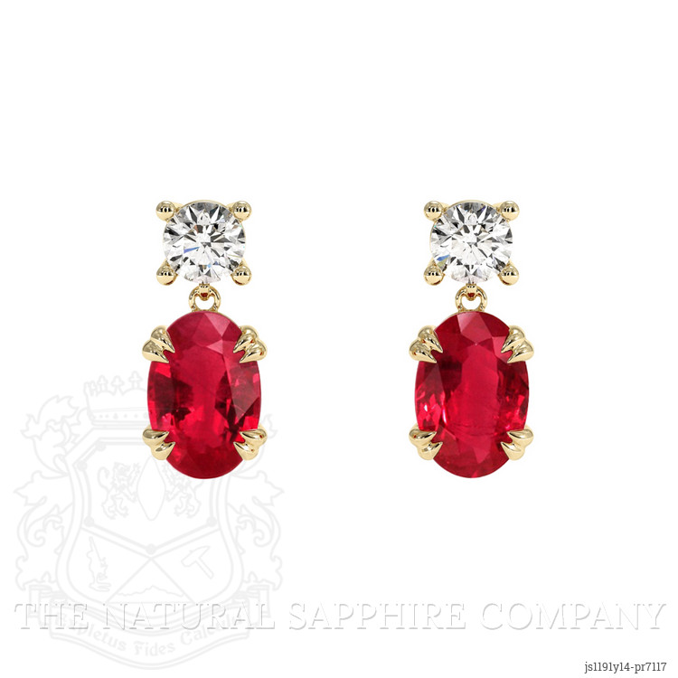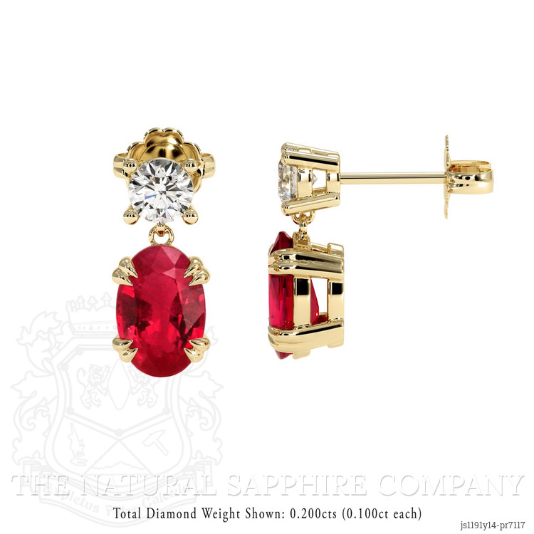 The overall design bridges vintage and contemporary sensibilities through a restrained, dual stone silhouette that reads as both timeless and current. The pairing of a classic white diamond stud above a suspended oval ruby is a motif rooted in traditional jewelry language, while the clean lines, minimal metal profile, and mixed brilliant cutting of the rubies deliver a modern clarity and fire. This combination suits a range of wardrobes and occasions, from formal settings that favor refined heritage styling, to daily or evening wear where modern understatement is preferred. The 18K yellow gold setting adds warmth and a period appropriate tone for those drawn to vintage aesthetics, while the precision of the mounting and the vivid, highly polished gemstones reflect contemporary standards of gem cutting and finishing. Crafted and presented by The Natural Ruby Company, these earrings exemplify a considered approach to gemstone selection and design, offering a harmonious fusion of historical reference and present day refinement.