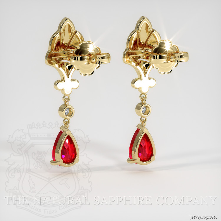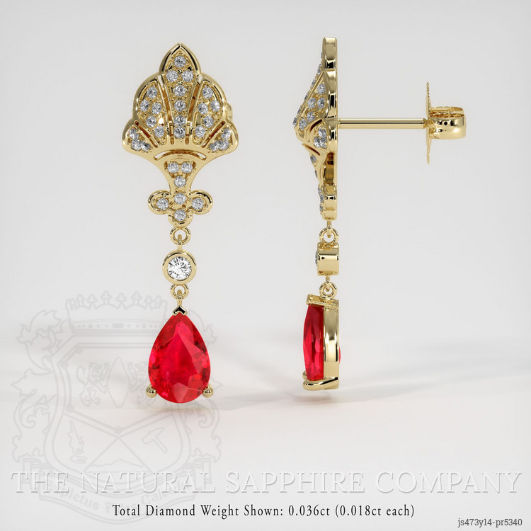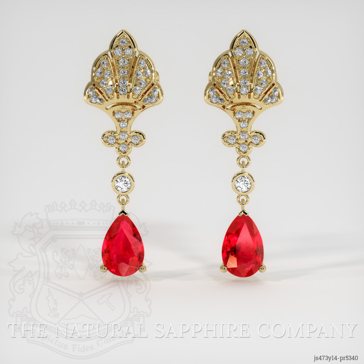 The earrings feature a beautiful, transparent pair of rubies that are 0.98 total carat weight. They are pear shape red rubies, with the dimensions of 6.13 x 4.12 x 2.47 mm and are mixed brilliant cut, have a clarity grade of very slightly included (evaluated at eye level), vivid color saturation, and an excellent polish. The origin of this pair of rubies is Mozambique.
