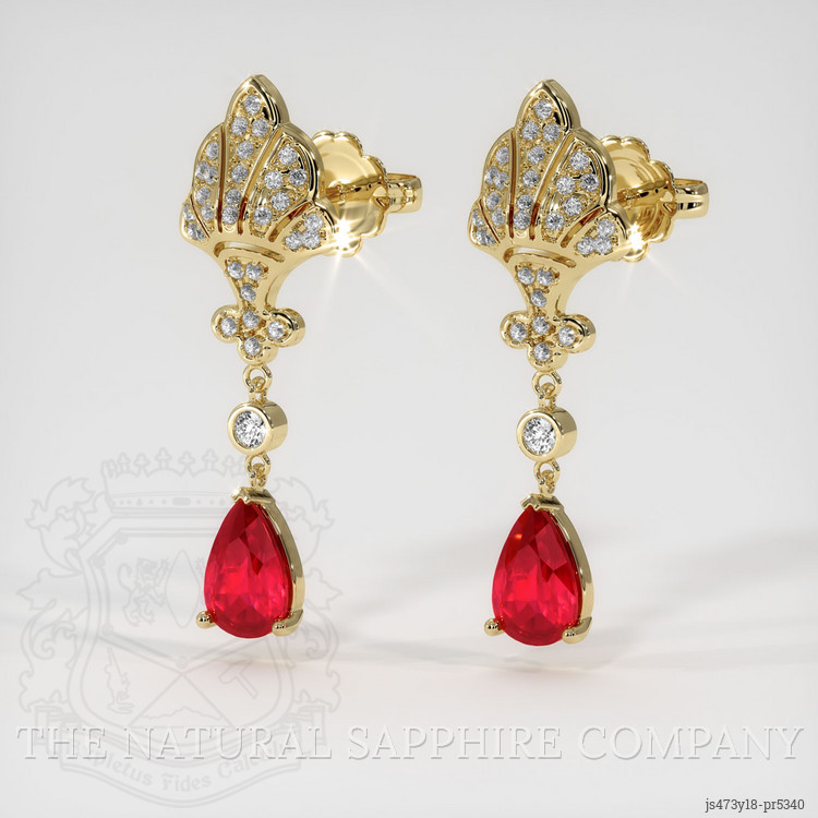 The earrings feature a beautiful, transparent pair of rubies that are 0.98 total carat weight. They are pear shape red rubies, with the dimensions of 6.13 x 4.12 x 2.47 mm and are mixed brilliant cut, have a clarity grade of very slightly included (evaluated at eye level), vivid color saturation, and an excellent polish. The origin of this pair of rubies is Mozambique.