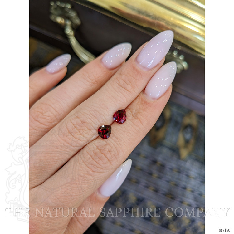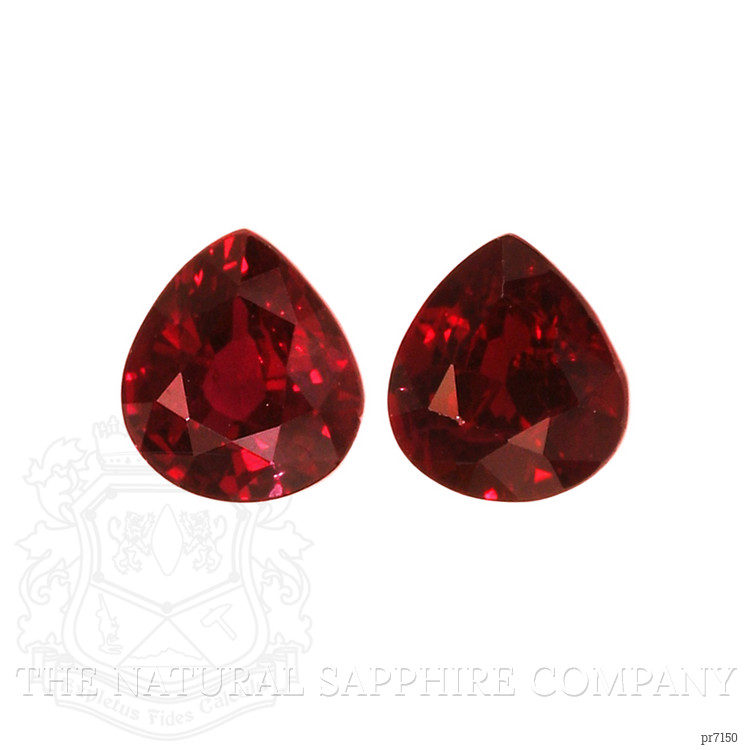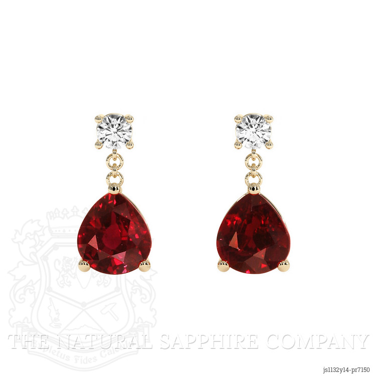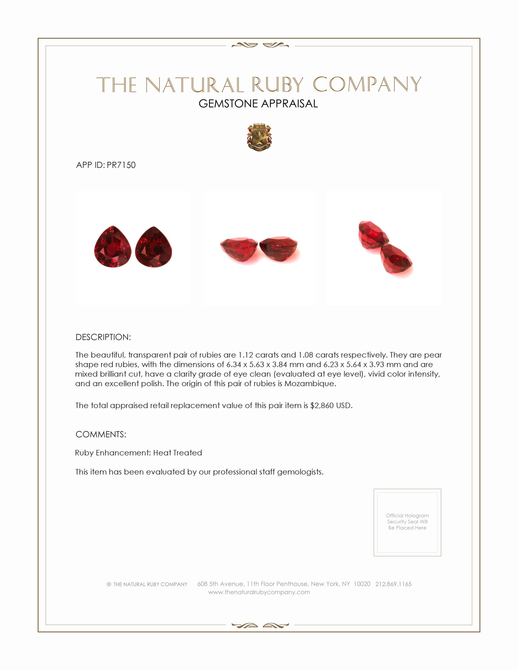Introducing the stunning pair of earrings from The Natural Ruby Company. Designed with meticulous craftsmanship, these earrings feature a captivating pair of transparent pear-shaped rubies. With a total weight of 2.20 carats, each ruby brings to life a vivid red color, enhanced through the expert technique of heat treatment. Masterfully cut in a mixed brilliant style and measuring 6.34 x 5.63 x 3.84 mm, these rubies are not only eye-catching but also exhibit a clarity grade known as eye clean, ensuring that they are free from inclusions visible to the naked eye. The excellent polish on these gems enhances their natural brilliance, making them a standout piece in any collection.