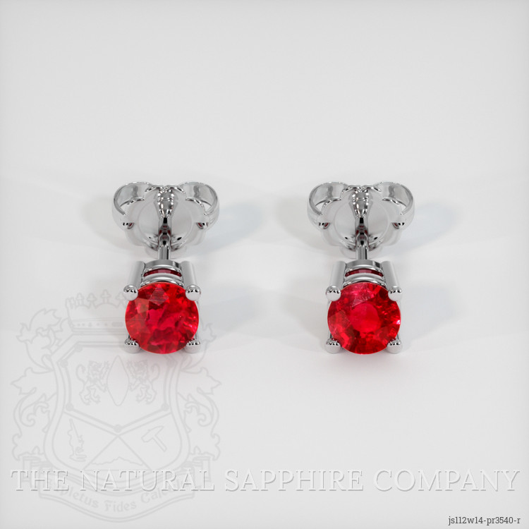 The earrings feature a beautiful, transparent pair of rubies that are 0.84 total carat weight. They are round shape red rubies, with the dimensions of 4.14 x 4.07 x 3.20 mm and are brilliant cut, have a clarity grade of very slightly included (evaluated at eye level), vivid color saturation, and an excellent polish. The origin of this pair of rubies is Mozambique.