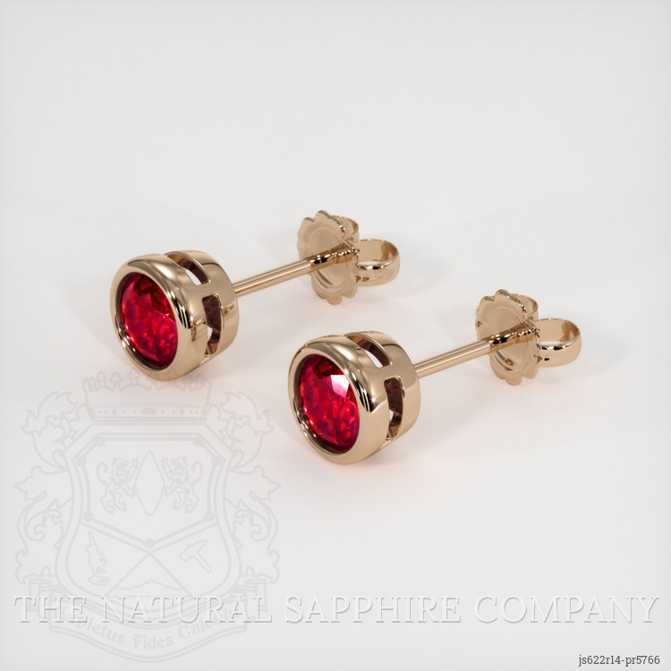 The earrings feature a beautiful, transparent pair of rubies that are 1.37 total carat weight. They are round shape red rubies, with the dimensions of 5.49 x 5.40 x 2.97 mm and are mixed brilliant cut, have a clarity grade of eye clean (evaluated at eye level), intense color saturation, and an excellent polish. The origin of this pair of rubies is Mozambique.