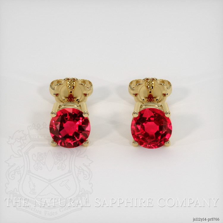 The earrings feature a beautiful, transparent pair of rubies that are 1.37 total carat weight. They are round shape red rubies, with the dimensions of 5.49 x 5.40 x 2.97 mm and are mixed brilliant cut, have a clarity grade of eye clean (evaluated at eye level), intense color saturation, and an excellent polish. The origin of this pair of rubies is Mozambique.