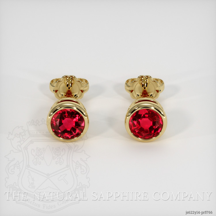 The earrings feature a beautiful, transparent pair of rubies that are 1.37 total carat weight. They are round shape red rubies, with the dimensions of 5.49 x 5.40 x 2.97 mm and are mixed brilliant cut, have a clarity grade of eye clean (evaluated at eye level), intense color saturation, and an excellent polish. The origin of this pair of rubies is Mozambique.