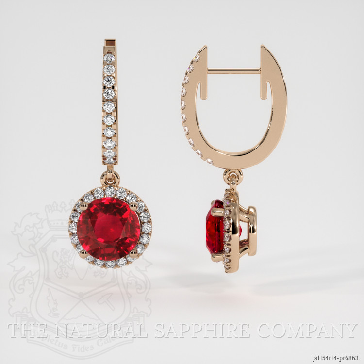 The earrings feature a beautiful, transparent pair of rubies that are 1.82 total carat weight. They are round shape red rubies, with the dimensions of 5.82 x 5.76 x 3.33 mm and are mixed brilliant cut, have a clarity grade of eye clean (evaluated at eye level), vivid color saturation, and an excellent polish. The origin of this pair of rubies is Mozambique.
