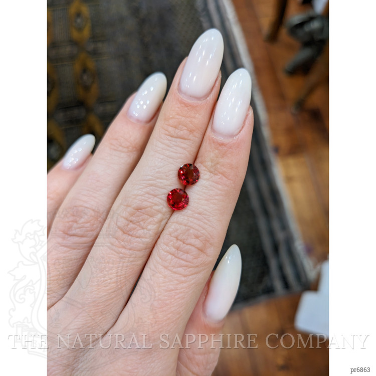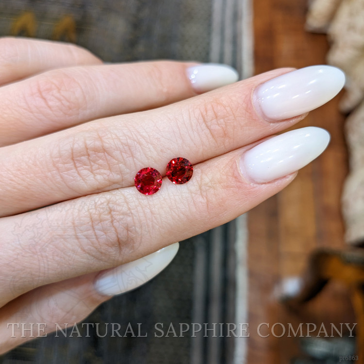 The earrings feature a beautiful, transparent pair of rubies that are 1.82 total carat weight. They are round shape red rubies, with the dimensions of 5.82 x 5.76 x 3.33 mm and are mixed brilliant cut, have a clarity grade of eye clean (evaluated at eye level), vivid color saturation, and an excellent polish. The origin of this pair of rubies is Mozambique.
