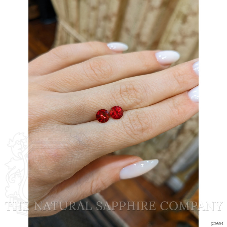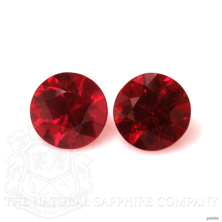 The earrings feature a beautiful, transparent pair of rubies that are 2.05 total carat weight. They are round shape red rubies, with the dimensions of 6.12 x 6.01 x 4.07 mm and are mixed brilliant cut, have a clarity grade of eye clean (evaluated at eye level), vivid color saturation, and an excellent polish. The origin of this pair of rubies is Mozambique.