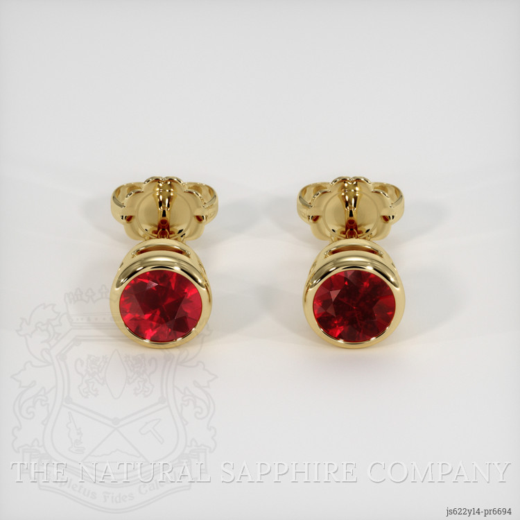 The earrings feature a beautiful, transparent pair of rubies that are 2.05 total carat weight. They are round shape red rubies, with the dimensions of 6.12 x 6.01 x 4.07 mm and are mixed brilliant cut, have a clarity grade of eye clean (evaluated at eye level), vivid color saturation, and an excellent polish. The origin of this pair of rubies is Mozambique.
