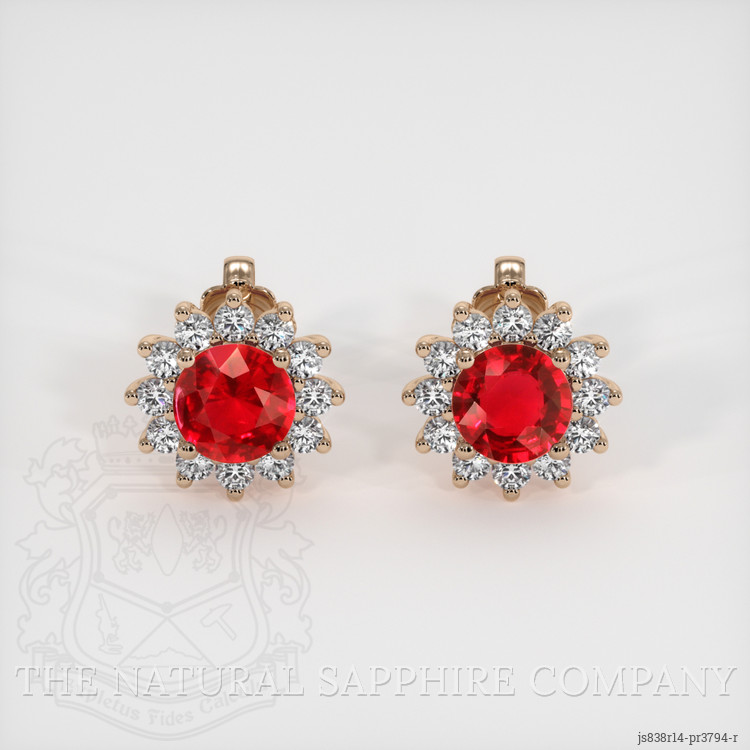 The earrings feature a beautiful, transparent GIA certified pair of rubies that are 2.16 total carat weight. They are round shape red rubies, with the dimensions of 6.31 x 6.23 x 3.77 mm and are mixed brilliant cut, have a clarity grade of very slightly included (evaluated at eye level), vivid color saturation, and an excellent polish. The origin of this pair of rubies is Mozambique.