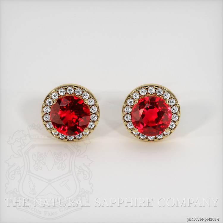 The earrings feature a beautiful, transparent pair of rubies that are 2.27 total carat weight. They are round shape red rubies, with the dimensions of 6.53 x 6.43 x 3.63 mm and are mixed brilliant cut, have a clarity grade of eye clean (evaluated at eye level), vivid color saturation, and an excellent polish. The origin of this pair of rubies is Mozambique.
