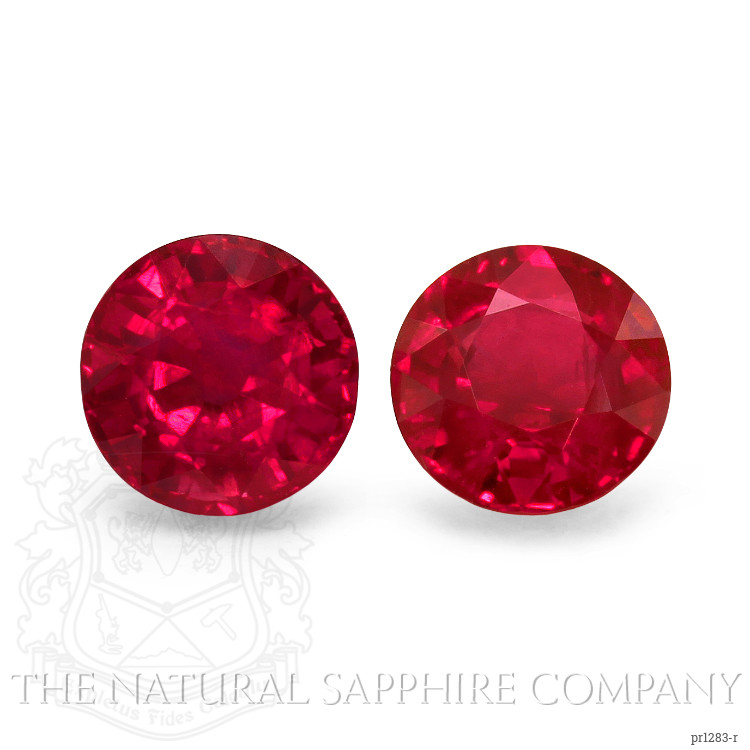 The earrings feature a beautiful, transparent pair of rubies that are 2.33 total carat weight. They are round shape red rubies, with the dimensions of 6.08 x 6.03 x 4.04 mm and are mixed brilliant cut, have a clarity grade of very slightly included (evaluated at eye level), vivid color saturation, and an excellent polish. The origin of this pair of rubies is Burma (Myanmar).