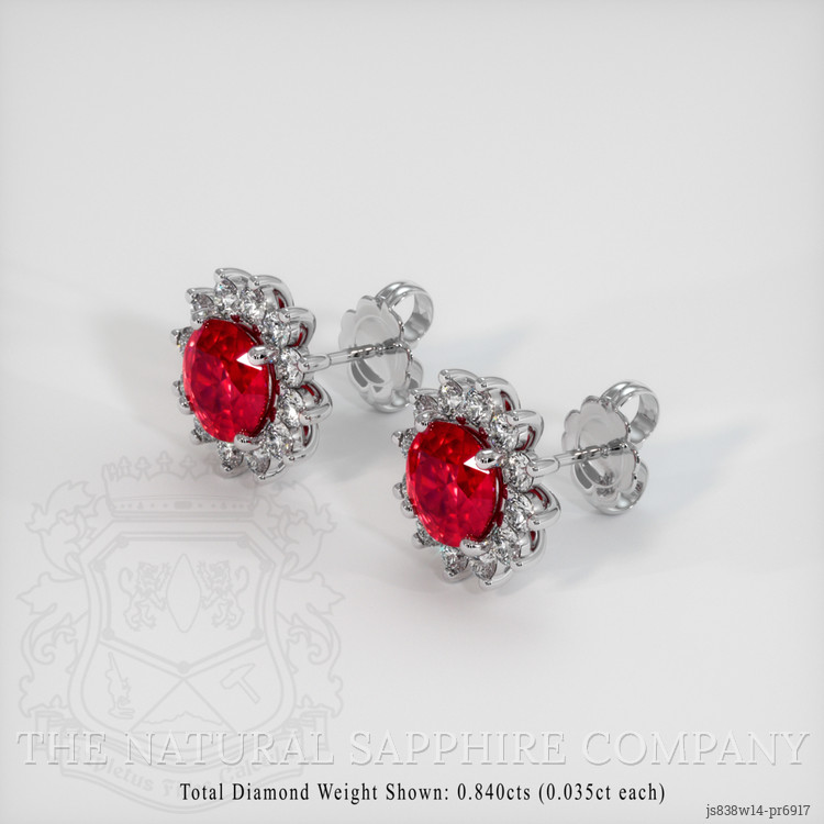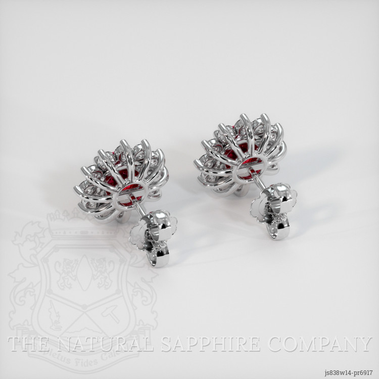 The earrings feature a beautiful, transparent pair of rubies that are 2.66 total carat weight. They are round shape red rubies, with the dimensions of 6.54 x 6.46 x 4.05 mm and are mixed brilliant cut, have a clarity grade of very slightly included (evaluated at eye level), vivid color saturation, and an excellent polish. The origin of this pair of rubies is Mozambique.