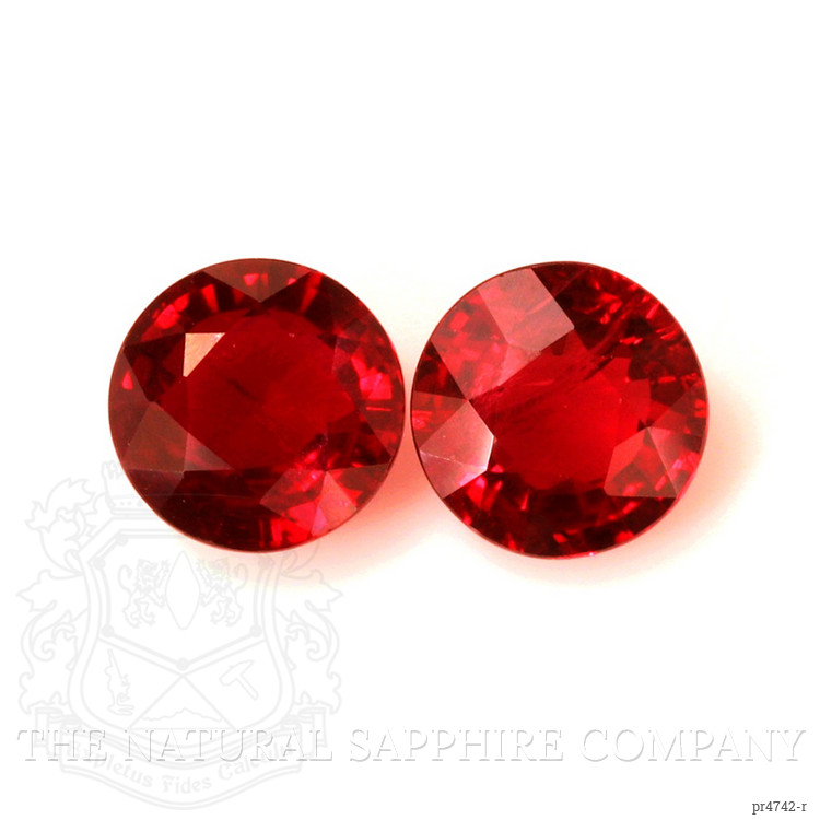 The earrings feature a beautiful, transparent pair of rubies that are 3.02 total carat weight. They are round shape red rubies, with the dimensions of 6.77 x 6.73 x 3.69 mm and are mixed brilliant cut, have a clarity grade of eye clean (evaluated at eye level), vivid color saturation, and an excellent polish. The origin of this pair of rubies is Mozambique.