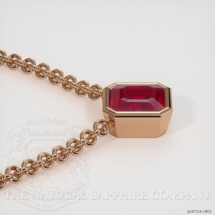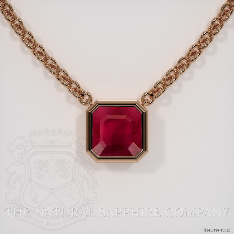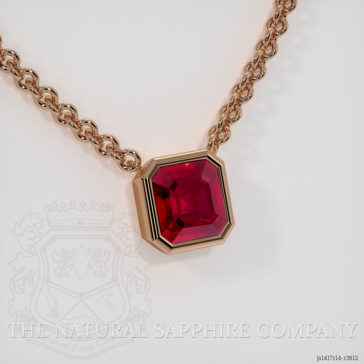 The necklace features a beautiful, transparent C.Dunaigre certified Intense Red 4.21 carat asscher - octagon shape red ruby with the dimensions of 8.84 x 8.70 x 5.04 mm and a asscher cut. It has a clarity grade of very slightly included (evaluated at eye level), vivid color saturation, and an excellent polish. The origin of this ruby is Burma (Myanmar).