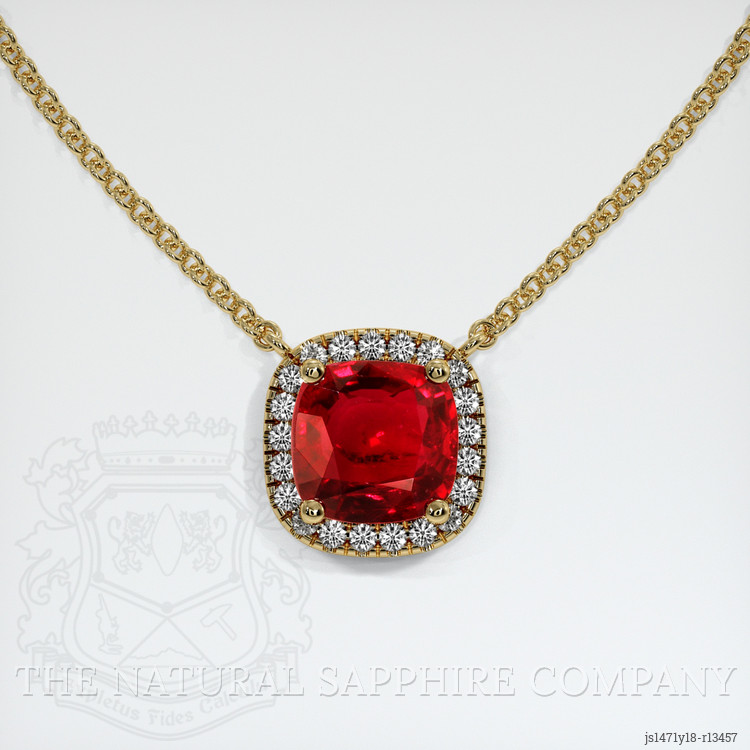 Indulge in the unparalleled elegance of The Natural Ruby Company's exquisite creation. This necklace, a paragon of sophistication, is set in lustrous 18K yellow gold, offering a timeless yet contemporary allure. The focal point, a transparent 1.58-carat cushion-shaped red ruby, possesses a unique beauty unrivaled in the world of gemstones. Certified by the Gemological Institute of America, this remarkable ruby from Mozambique epitomizes vivid color saturation and exceptional craftsmanship. Its dimensions of 6.91 by 6.69 by 3.36 mm are meticulously cut to a mixed brilliant finish, reflecting an unwavering commitment to quality and elegance. Slightly included to the discerning eye, the gemstone invites admiration and intrigue, becoming an emblem of your impeccable taste.