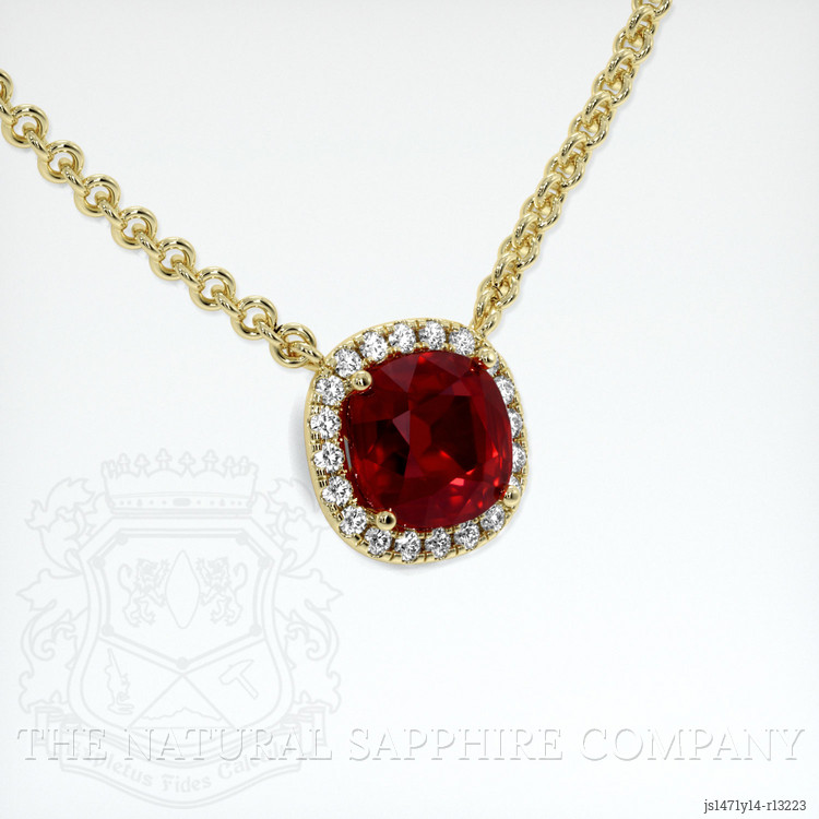 In the heart of Mozambique's vibrant landscapes, cradled by the earth's gentle embrace, lies a gem of unmatched beauty—the Vivid Red “Pigeon’s Blood” ruby. At The Natural Ruby Company, we embark on an enchanting journey to unearth and transform this rare treasure into a masterpiece that captivates the soul. Our skilled artisans have meticulously crafted this necklace set in 18K yellow gold, allowing the ruby to reveal its innate, passionate glow. This 2.03-carat ruby, certified by C.Dunaigre, with its cushion shape and mixed brilliant cut, tells stories of time immemorial, where the earth whispers secrets into the stones it guards. The ruby's dimensions, 7.23 x 7.11 x 4.13 mm, and its vibrant, vivid color saturation with a clarity grade of very slightly included, speak volumes of its authenticity and origin.