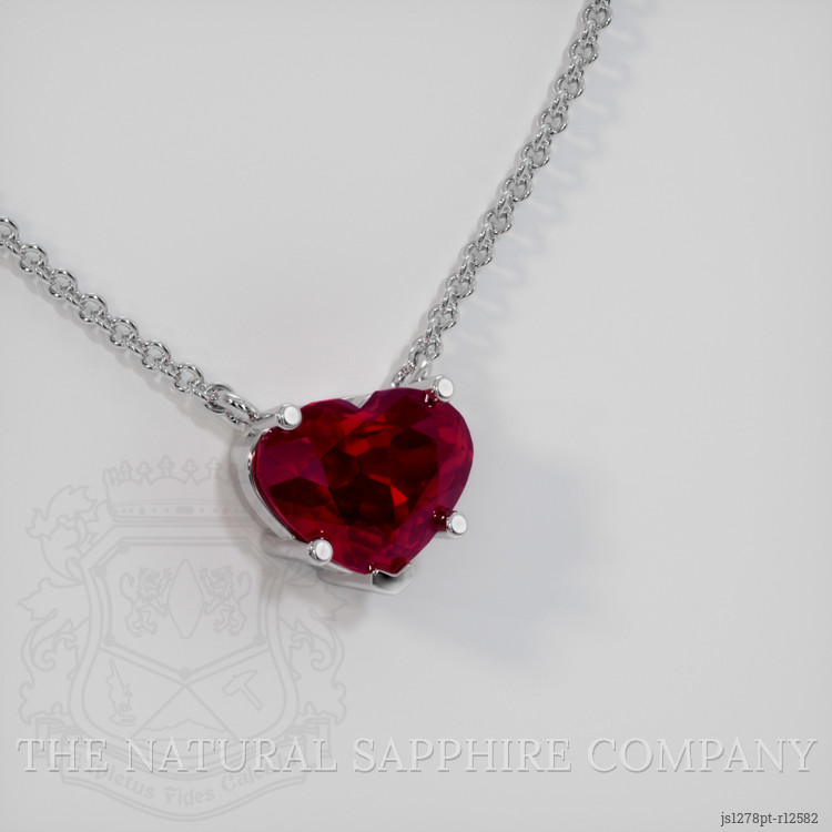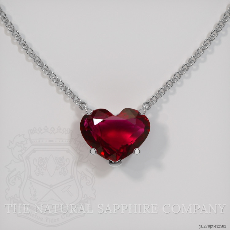 The necklace features a beautiful, transparent GIA certified Red 1.65 carat heart shape red ruby with the dimensions of 6.37 x 8.35 x 3.58 mm and a mixed brilliant cut. It has a clarity grade of eye clean (evaluated at eye level), vivid color saturation, and an excellent polish. The origin of this ruby is Mozambique.