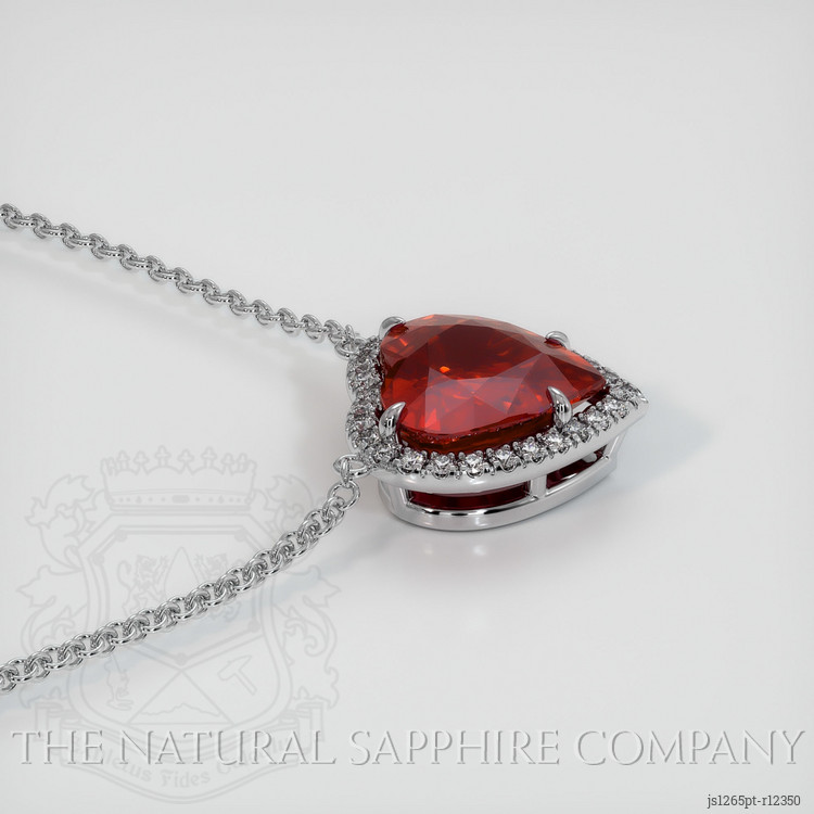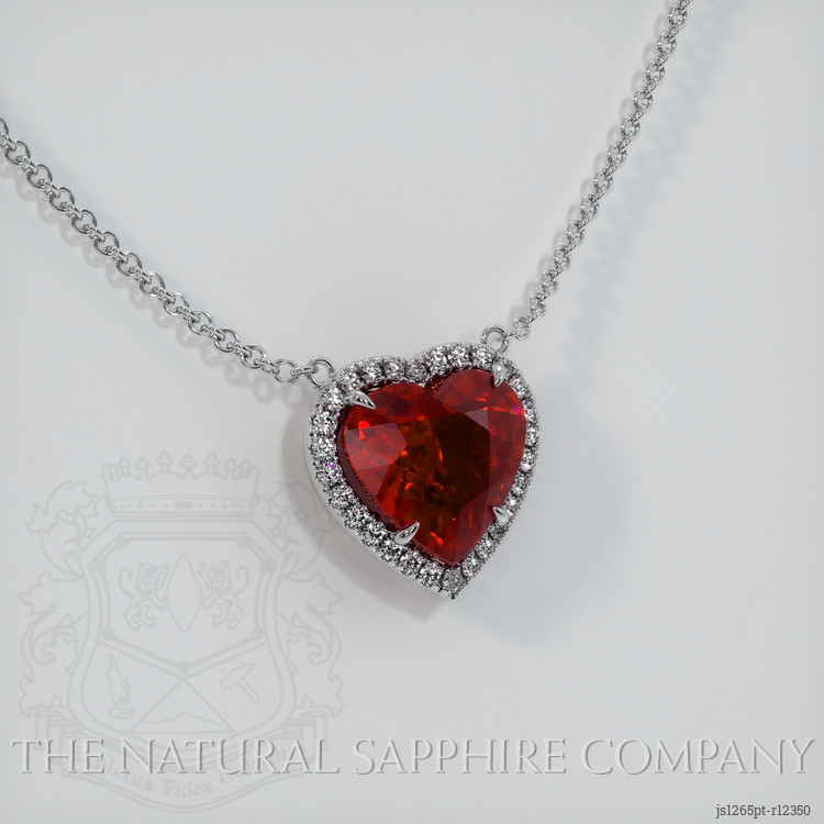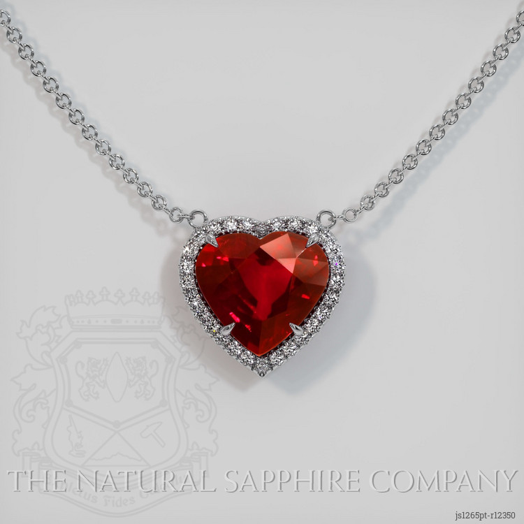 The necklace features a beautiful, transparent GRS certified Vivid Red “Pigeon’s Blood” 8.01 carat heart shape red ruby with the dimensions of 12.41 x 13.34 x 6.52 mm and a mixed brilliant cut. It has a clarity grade of eye clean (evaluated at eye level), vivid color saturation, and an excellent polish. The origin of this ruby is Mozambique.