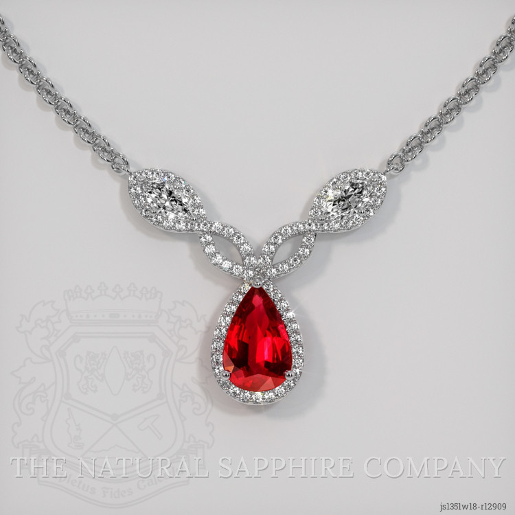 The necklace features a beautiful, transparent C.Dunaigre certified Vivid Red “Pigeon’s Blood” 3.05 carat pear shape red ruby with the dimensions of 13.21 x 8.37 x 3.64 mm and a mixed brilliant cut. It has a clarity grade of eye clean (evaluated at eye level), vivid color saturation, and an excellent polish. The origin of this ruby is Mozambique.