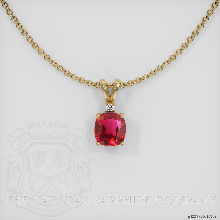 The pendant features a beautiful, transparent GIA certified Red 1.74 carat cushion shape red ruby with the dimensions of 6.96 x 6.34 x 4.10 mm and a mixed brilliant cut. It has a clarity grade of very slightly included (evaluated at eye level), intense color saturation, and an excellent polish. The origin of this ruby is Mozambique.