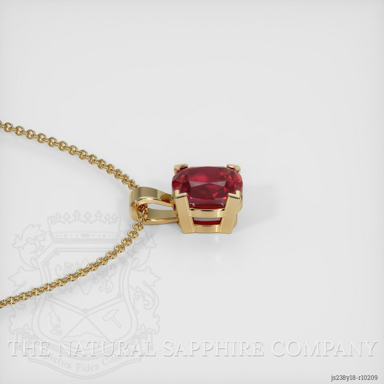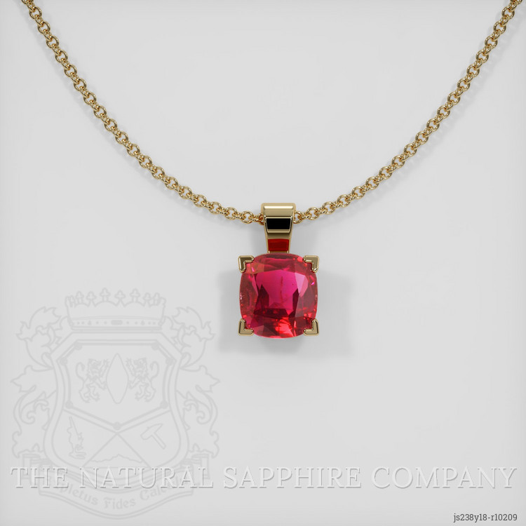 The pendant features a beautiful, transparent GIA certified Red 1.74 carat cushion shape red ruby with the dimensions of 6.96 x 6.34 x 4.10 mm and a mixed brilliant cut. It has a clarity grade of very slightly included (evaluated at eye level), intense color saturation, and an excellent polish. The origin of this ruby is Mozambique.