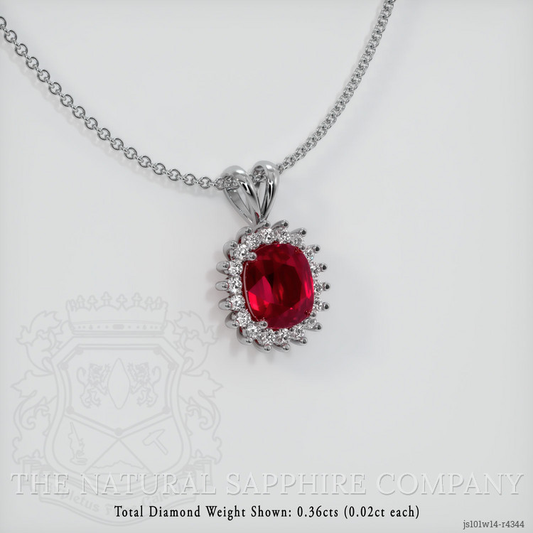 The pendant features a beautiful, transparent GRS certified Vivid Red 2.98 carat cushion shape red ruby with the dimensions of 8.72 x 7.66 x 4.66 mm and a mixed brilliant cut. It has a clarity grade of very slightly included (evaluated at eye level), vivid color saturation, and an excellent polish. The origin of this ruby is Mozambique.
