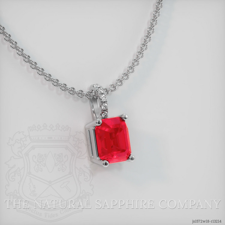 The pendant features a beautiful, transparent GIA certified Red 1.14 carat emerald cut shape red ruby with the dimensions of 6.22 x 4.96 x 3.71 mm and a step cut. It has a clarity grade of very slightly included (evaluated at eye level), vivid color saturation, and an excellent polish. Enhancement: no enhancement. The origin of this ruby is Mozambique.