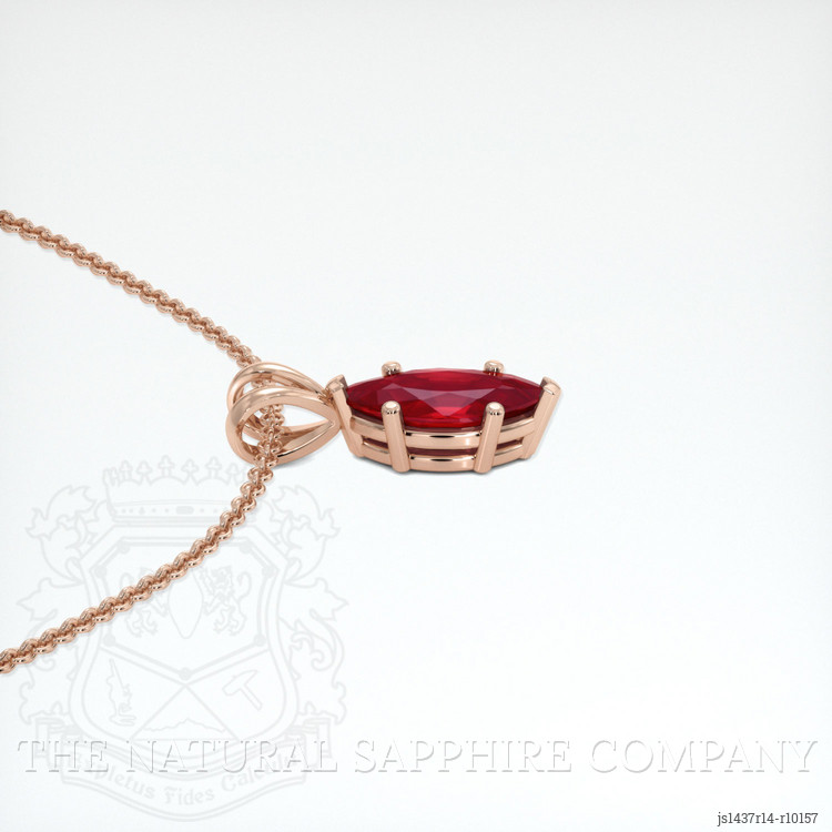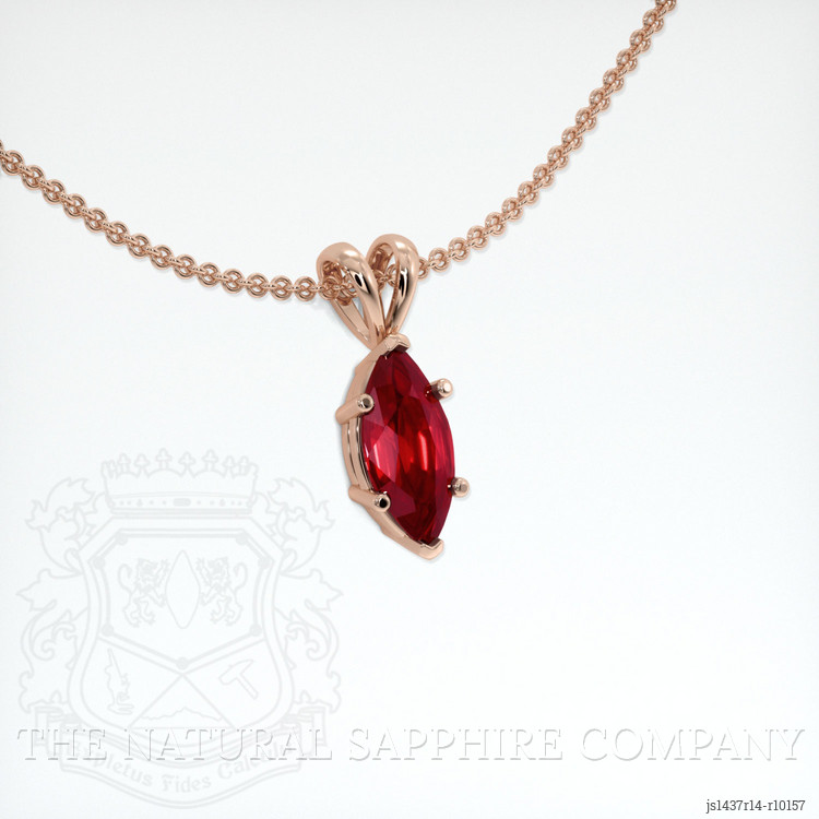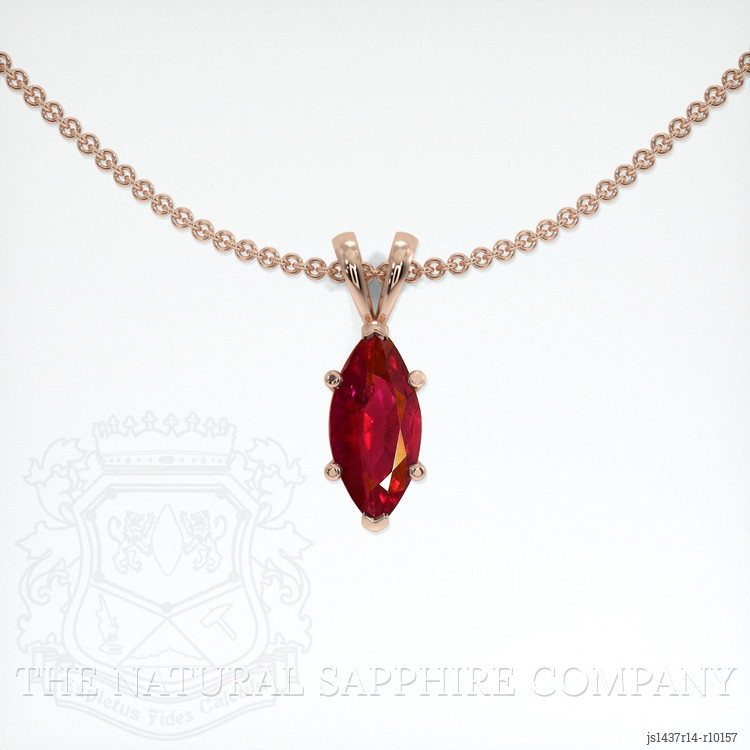 Introducing a masterpiece of exquisite design and craftsmanship from The Natural Ruby Company, this pendant is a testament to the elegance of fine jewelry. Encased entirely in 14K rose gold, the pendant's warm hue complements a range of skin tones and enhances the ruby's natural vivacity. The centerpiece of this elegant piece is a stunning 0.57 carat marquise-shaped ruby, offering a unique and sophisticated silhouette that sets it apart from more traditional cuts. With dimensions of 8.19 x 3.94 x 2.52 mm, the ruby is perfectly proportioned, showcasing its luster and adding a sparkling focal point to any ensemble.