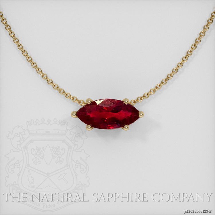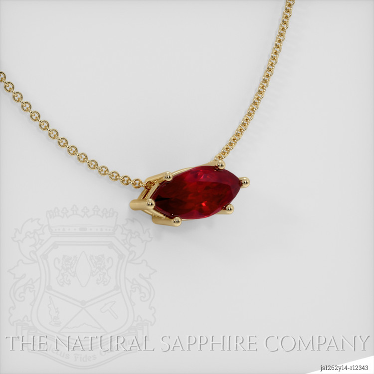 The pendant features a beautiful, transparent 0.58 carat marquise shape red ruby with the dimensions of 8.00 x 3.75 x 2.55 mm and a mixed brilliant cut. It has a clarity grade of slightly included (evaluated at eye level), vivid color saturation, and an excellent polish. The origin of this ruby is Burma (Myanmar).