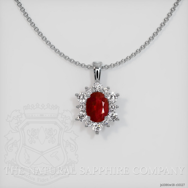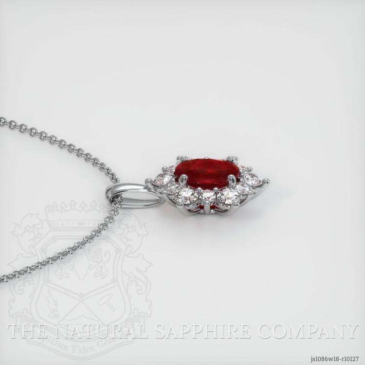The pendant features a beautiful, transparent 1.54 carat oval shape pinkish red ruby with the dimensions of 8.14 x 6.11 x 3.75 mm and a mixed brilliant cut. It has a clarity grade of slightly included (evaluated at eye level), vivid color saturation, and an excellent polish. The origin of this ruby is Burma (Myanmar).