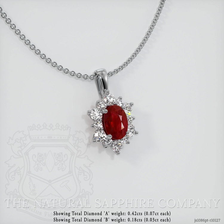 The pendant features a beautiful, transparent 1.54 carat oval shape pinkish red ruby with the dimensions of 8.14 x 6.11 x 3.75 mm and a mixed brilliant cut. It has a clarity grade of slightly included (evaluated at eye level), vivid color saturation, and an excellent polish. The origin of this ruby is Burma (Myanmar).