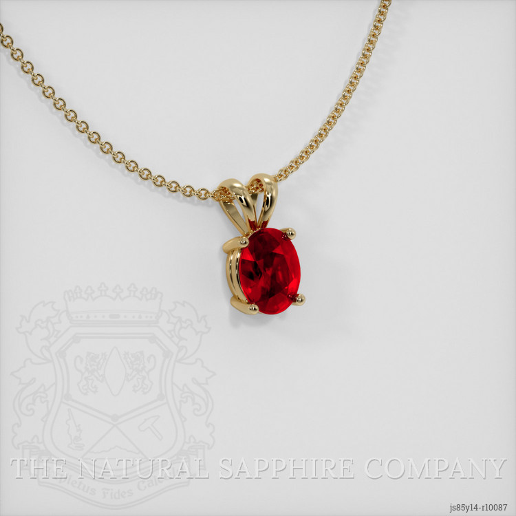 The pendant features a beautiful, transparent GRS certified Vivid to Deep Red 2.00 carat oval shape red ruby with the dimensions of 8.92 x 6.99 x 3.90 mm and a mixed brilliant cut. It has a clarity grade of very slightly included (evaluated at eye level), vivid color saturation, and an excellent polish. The origin of this ruby is Mozambique.