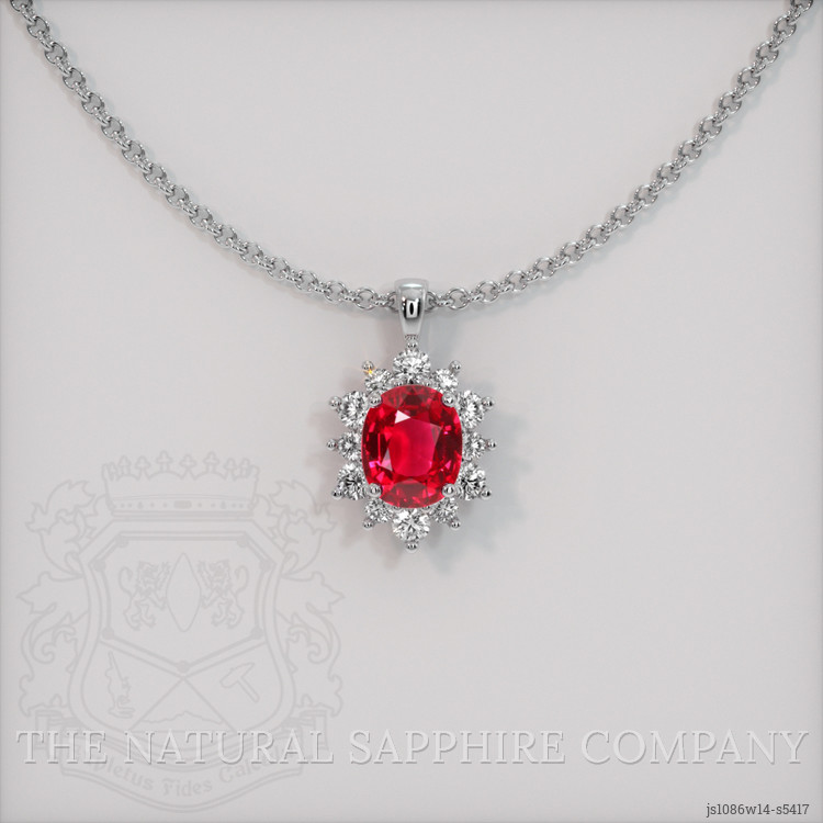 The pendant features a beautiful, transparent C.Dunaigre certified Vivid Red 2.18 carat oval shape red ruby with the dimensions of 8.47 x 6.96 x 4.18 mm and a mixed brilliant cut. It has a clarity grade of eye clean (evaluated at eye level), vivid color saturation, and an excellent polish. The origin of this ruby is Mozambique.