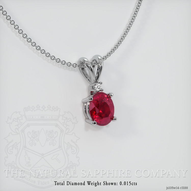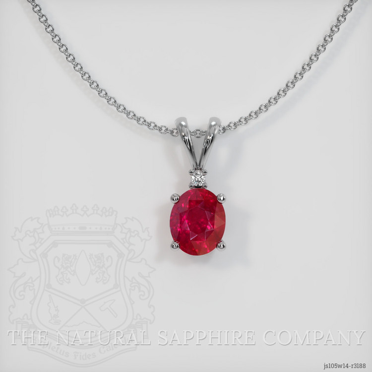 The pendant features a beautiful, transparent GIA certified Red 2.31 carat oval shape red ruby with the dimensions of 8.24 x 6.81 x 5.25 mm and a modified brilliant cut. It has a clarity grade of slightly included (evaluated at eye level), vivid color saturation, and an excellent polish. The origin of this ruby is Tanzania.