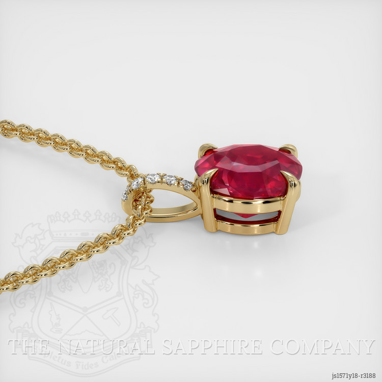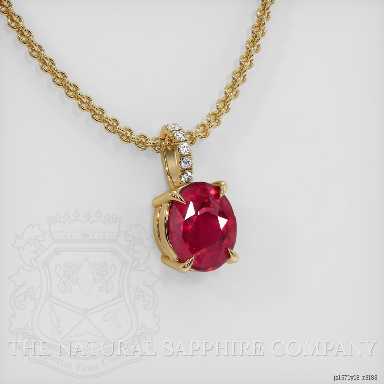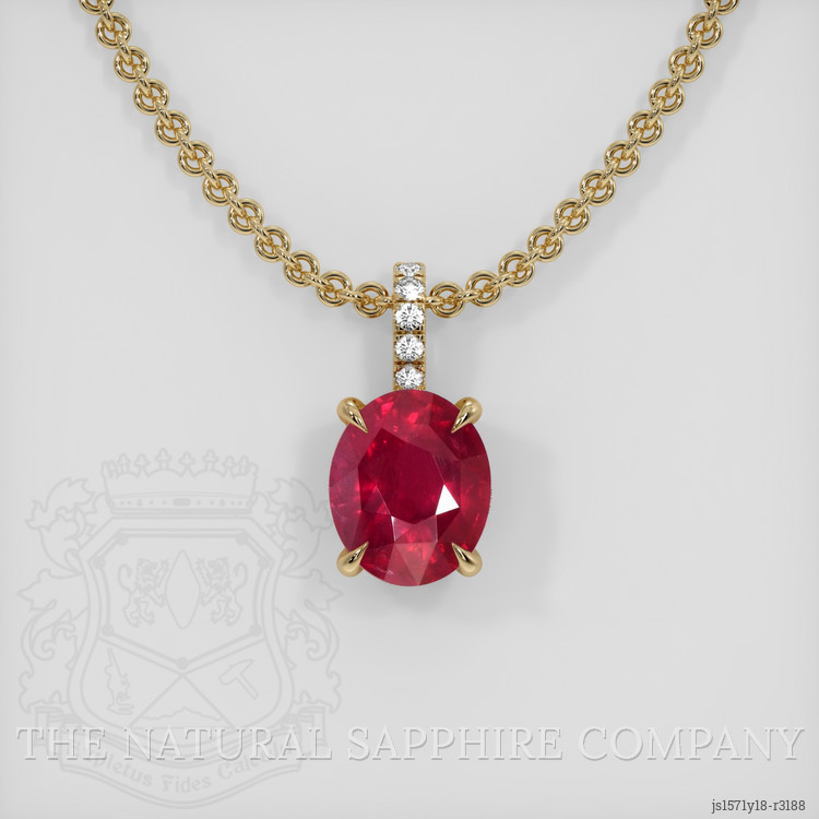 The pendant features a beautiful, transparent GIA certified Red 2.31 carat oval shape red ruby with the dimensions of 8.24 x 6.81 x 5.25 mm and a modified brilliant cut. It has a clarity grade of slightly included (evaluated at eye level), vivid color saturation, and an excellent polish. The origin of this ruby is Tanzania.