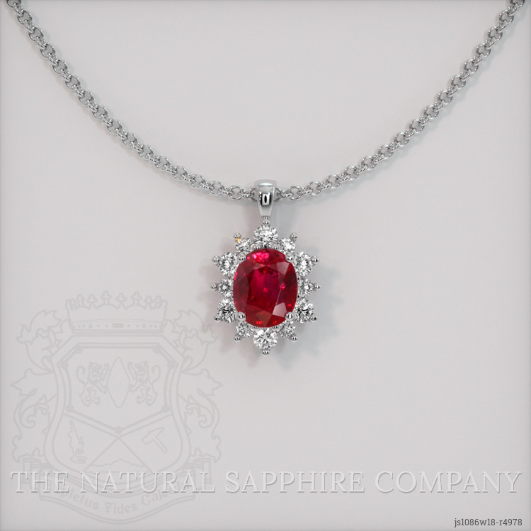 The pendant features a beautiful, transparent GRS certified Vivid Red 2.35 carat oval shape red ruby with the dimensions of 8.22 x 6.73 x 4.79 mm and a mixed brilliant cut. It has a clarity grade of slightly included (evaluated at eye level), vivid color saturation, and an excellent polish. The origin of this ruby is Mozambique.