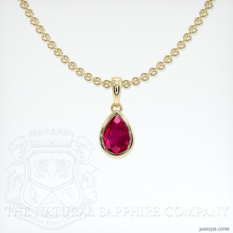 The Natural Ruby Company presents a stunning pendant that exemplifies both exquisite craftsmanship and unmatched elegance. Set entirely in 14K yellow gold, this pendant is a timeless piece that caters to the discerning taste of an educated buyer. Central to its design is a captivating 0.46 carat pear-shaped ruby with dimensions of 5.76 x 3.92 x 2.50 mm. The ruby has been meticulously cut in a mixed brilliant style to enhance its innate radiance, offering a sparkling display that mesmerizes onlookers. The pearl of Mozambique, this ruby showcases an intense color saturation that echoes the lush landscapes of its origin. Its slightly included clarity grade, evaluated at eye level, ensures that the gemstone retains a natural character and authenticity, enhancing its value among those who appreciate nature's unique imprints.