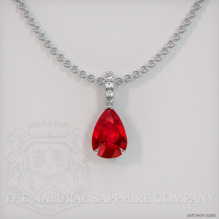 The pendant features a beautiful, transparent 1.31 carat pear shape red ruby with the dimensions of 8.39 x 5.76 x 3.63 mm and a mixed brilliant cut. It has a clarity grade of eye clean (evaluated at eye level), vivid color saturation, and an excellent polish. The origin of this ruby is Mozambique.